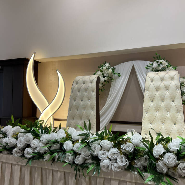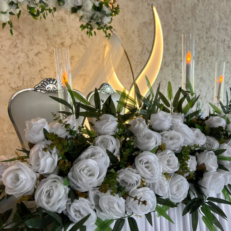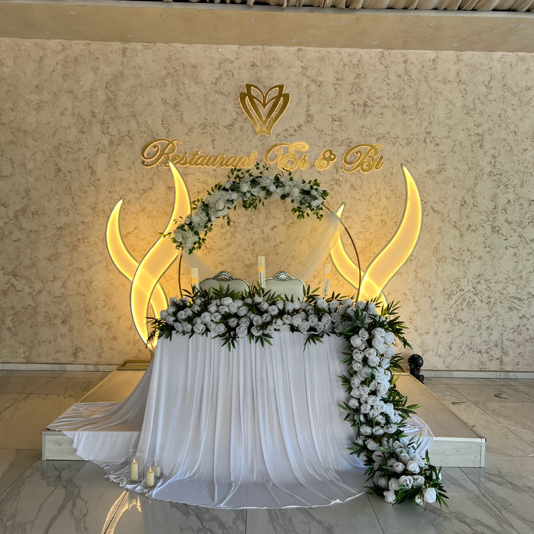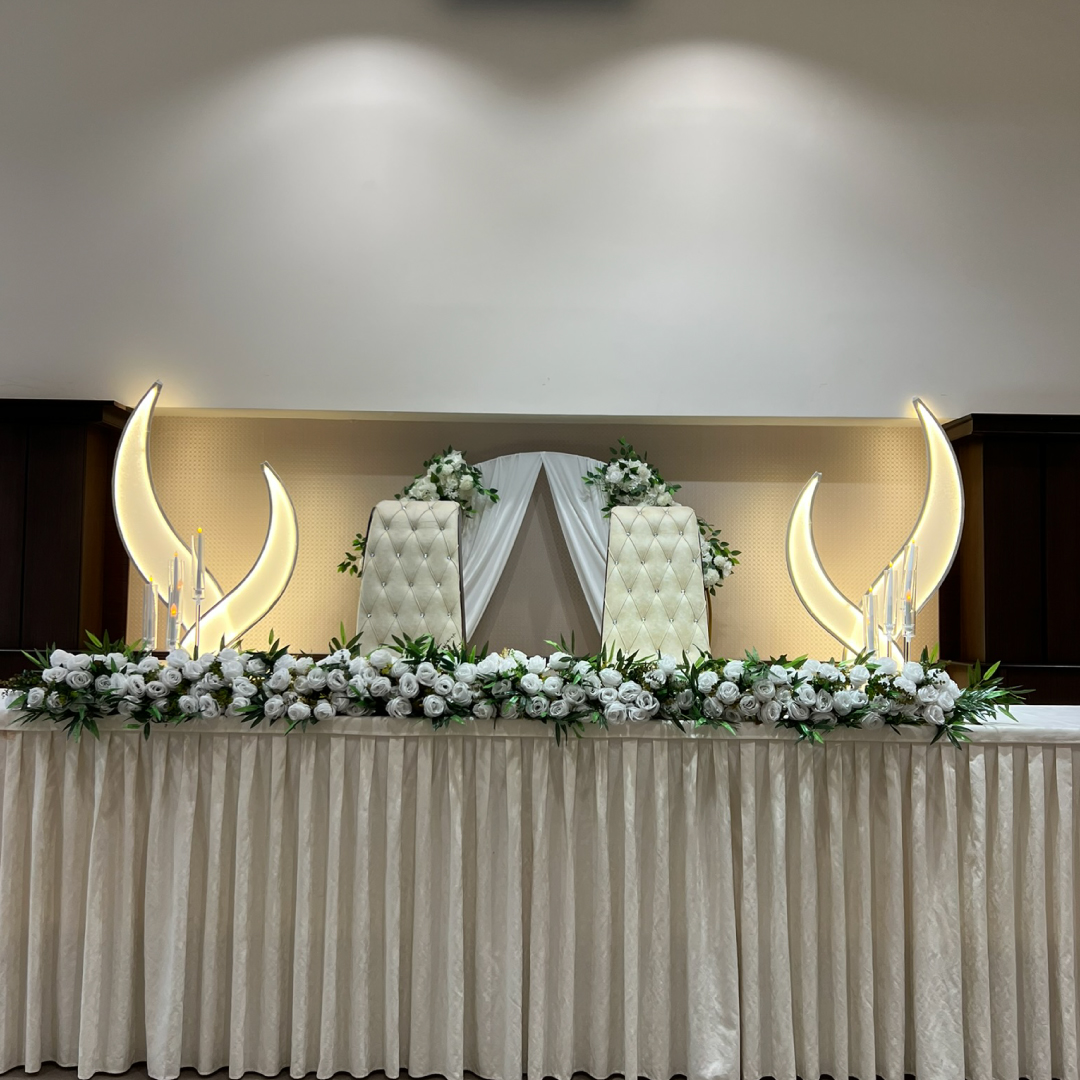 The combination of rich white roses, modern light elements, and the stylish circular backdrop gives the decor a premium and exclusive feel, perfect for the couple’s table and main stage. Every detail is carefully arranged to create balance, harmony, and a beautiful visual impact, ideal for both the ceremony and wedding photography.