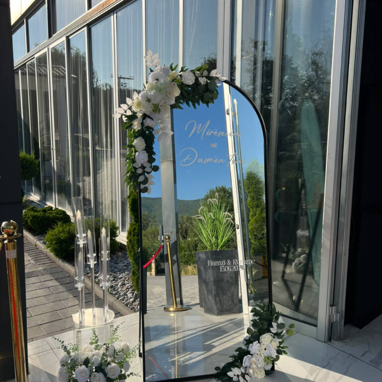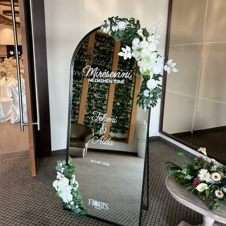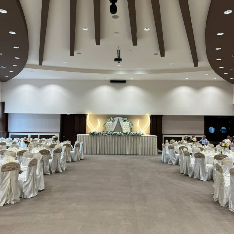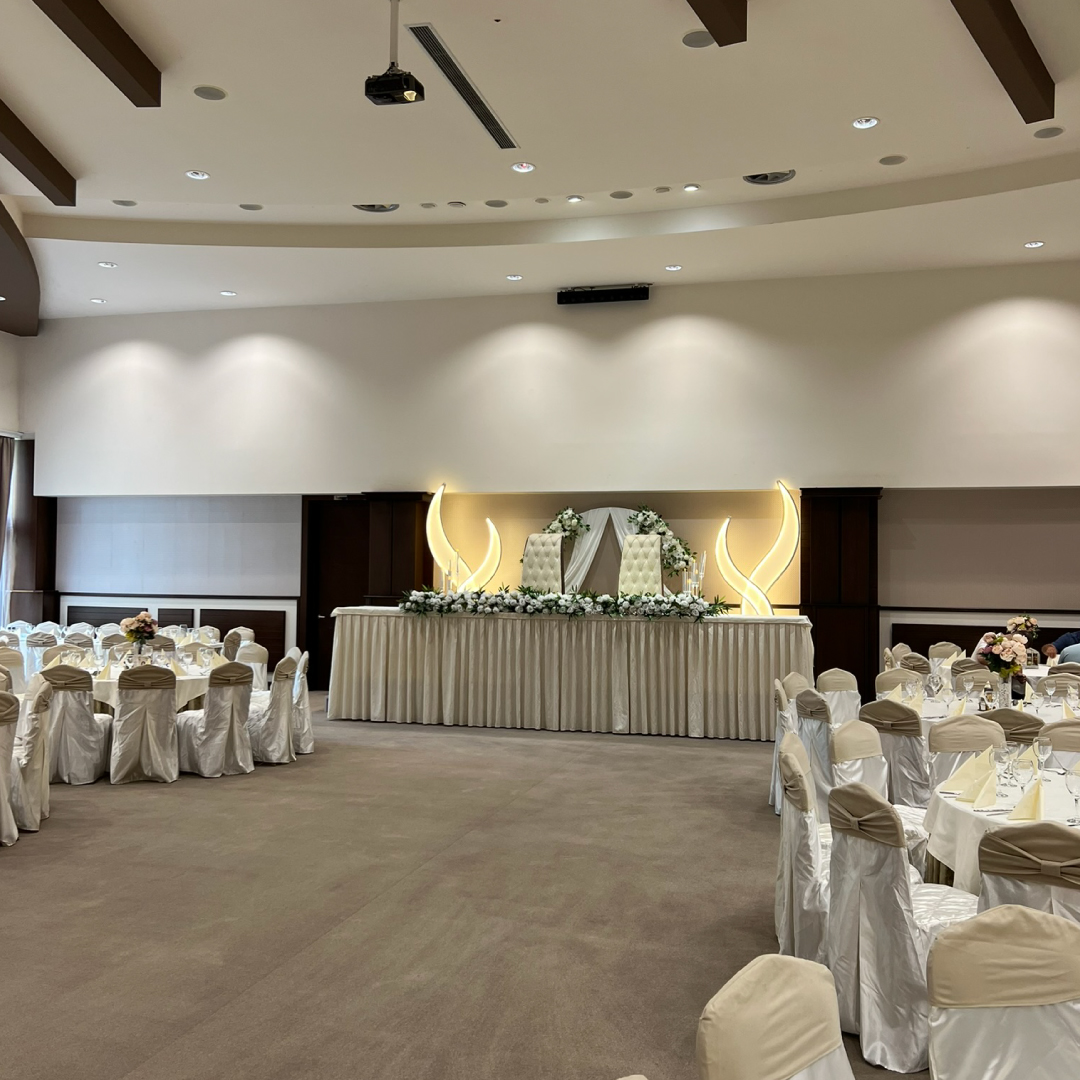 The combination of rich white roses, modern light elements, and the stylish circular backdrop gives the decor a premium and exclusive feel, perfect for the couple’s table and main stage. Every detail is carefully arranged to create balance, harmony, and a beautiful visual impact, ideal for both the ceremony and wedding photography.