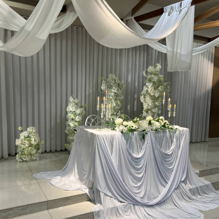 Serenata is an elegant wedding decor designed exclusively for weddings, created to bring a romantic, luxurious, and timeless atmosphere to your special day. The combination of soft white drapery, rich floral arrangements, and candlelight details creates a clean and sophisticated setting, perfect for unforgettable wedding moments and beautiful photos.