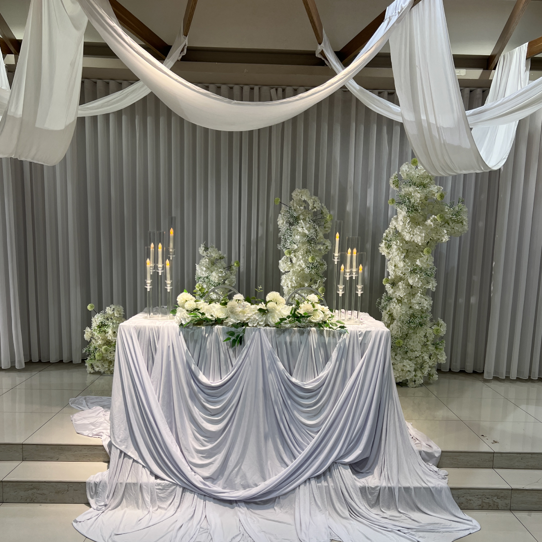 Serenata is an elegant wedding decor designed exclusively for weddings, created to bring a romantic, luxurious, and timeless atmosphere to your special day. The combination of soft white drapery, rich floral arrangements, and candlelight details creates a clean and sophisticated setting, perfect for unforgettable wedding moments and beautiful photos.